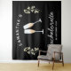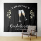 tapisserie personnalisée pour enterrement de vie de jeune fille rétro en noir et blanc avec des verres à champagne est parfaite comme décoration de fond pour photos de fête d'enterrement de vie de jeune fille. Célébrez votre douche de mariage avec style avec le thème parfait de fête au champagne en noir et blanc, le thème parfait pour la mariée nostalgique des années 70 et ses demoiselles d'honneur.