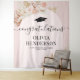 Tapisserie bohème élégante de fin d'études avec un fond rose poussiéreux avec une arche florale, feuilles de palmier séchées du désert aquarelle, herbe de pampas, un chapeau de diplômé, le titre "félicitations", leur nom, école et année de classe.