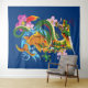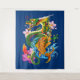 Un dragon chinois vert avec un koi orange avec fleurs de lotus et fleurs de cerisiers sur fond de bleu foncé.