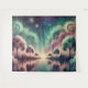 Cette conception éthérée représente un paysage onirique paisible où des arbres stylisés à baldaquins en spirale bordent une voie navigable réfléchissante sous un ciel cosmique. Les tons turquoises, lavande et rose se fondent harmonieusement dans des nuages doux, modelés en tourbillons géométriques. L'horizon lumineux et les accents célestes créent une atmosphère sereine et surréaliste qui se sent à la fois futuriste et surréaliste.