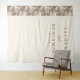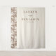 This elegant wedding backdrop features a minimalist design with a vertical layout, divided into two sections. The left side showcases a subtle pattern of trees and houses in muted brown tones against a cream background, while the right side remains blank to highlight the centered text. The sophisticated serif typography adds a classic touch, making it perfect for personalization with names and dates. The overall aesthetic is timeless and refined, ideal for creating a serene and stylish atmosphere at your special event.