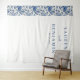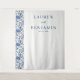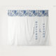 This elegant wedding backdrop features a balanced vertical layout with a floral pattern on the left, showcasing deep blue flowers and green leaves on a white background. The right side is clean and simple, providing ample space for customizable text in bold serif fonts that add a formal touch. The design combines sophistication and romance, perfect for creating a memorable atmosphere at your special event. Its classic style and harmonious color palette make it an ideal choice for weddings or significant celebrations.