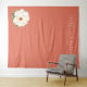 This wedding backdrop features a minimalist design with a warm coral background, creating an inviting and sophisticated atmosphere. The layout includes customizable text in a clean, sans-serif font at the top center, accompanied by a beautifully illustrated white peony flower with green leaves in the bottom left corner. The modern art technique highlights smooth gradients and clean lines, enhancing the contemporary elegance of the piece. Perfect for celebrating special moments, this backdrop combines understated beauty with personalization options, making it ideal for weddings or formal events.