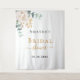 Un fond blanc chic. Décoré avec une fleur blanche (pivoine) et des feuilles d'eucalyptus à l'aquarelle verte, des brindilles, du feuillage et une brindille en faux or. Personnalisez et ajoutez le nom de la future mariée et une date. Lettres noires et dorées. Peut être utilisé à la fois comme bannière de bienvenue et comme décoration murale de fête.