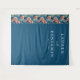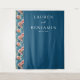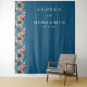 This elegant wedding backdrop features a split design with a vibrant floral pattern on the left and a solid dark teal background on the right. The floral side showcases stylized pink and coral flowers with green leaves, creating a lively border effect against a navy blue base. On the teal side, customizable text is elegantly displayed in a classic serif font, offering a sophisticated touch to your special day. The overall mood is joyful and refined, perfect for celebrating love and commitment at your wedding ceremony or reception.