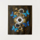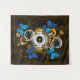 Composition de l'horloge ronde steampunk avec cadran romain noir, décoré avec des engrenages or et laiton, papillons Morpho bleu et lentilles endommagées sur arrière - plan rayé brun. Style Steampunk.