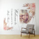 Une tapisserie de bienvenue pour une baby shower élégante et moderne. Fond blanc, décoré avec de l'herbe de pampa de style boho et des fleurs rose pastel et or rose. Personnalisez et ajoutez une photo à l'intérieur du cadre de l'arche, nom.