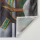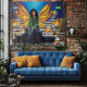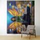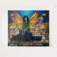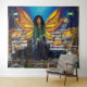 Une fée aux ailes orange et jaune sur des marches en pierre qui mènent peut-être au royaume des Fées. La Fée afro-américaine n'est pas seule, elle est avec son chien doberman gardien ce jour d'automne.