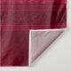 Tapisserie avec un fond rouge décoré de volutes élégantes et de motifs ornementaux le long des bordures.