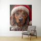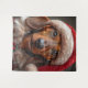 L'image montre un adorable dachshund habillé en tenue festive, avec un casquette du Père Noël rouge à la garniture blanche et moelleuse. Les grands yeux expressifs et le nez noir brillant du chien sont les points focaux du gros plan, créant une atmosphère de vacances charmante et pleine de charme. Le dachshund porte également une tenue confortable rouge avec un collier de fausse fourrure, ajoutant à l'atmosphère festive et chaleureuse de la scène.