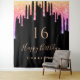 Une tapisserie tendance et glamour Sweet 16, 16ème (ou âge de bonbons) anniversaire. Un arrière - plan noir classique décoré avec des gouttes de parties scintillant irrégulière de couleur arc-en-ciel, la peinture goutte à goutte dans l'or violet, rose et rose. Avec le texte : 16 Joyeux anniversaire. Personnalisez et ajoutez un nom. Texte de couleur dorée. Peut être utilisé comme bannière de bienvenue, fond de cabine photo et décoration murale de fête.
