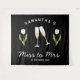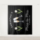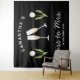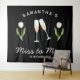 Tapisserie personnalisée de fête de fiançailles rétro Mademoiselle à Madame en noir et blanc avec des verres à champagne et une tulipe blanche, parfaite comme toile de fond pour les photos de fête de fiançailles. Célébrez votre douche de mariée avec style avec le thème parfait de la fête du champagne en noir et blanc, le thème parfait pour la mariée nostalgique vintage des années 70 et ses demoiselles d'honneur.