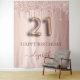 Une tapisserie pour une fête de 21 ans girly et glamour. Un fond dégradé rose et or rose avec des gouttes de fausse brillance couleur or rose élégantes, aspect de peinture qui goutte. Avec le texte : Joyeux Anniversaire. Personnalisez et ajoutez un nom. Le nom est écrit en or rose foncé avec un style d'écriture moderne à la main avec des fioritures. Le numéro 21 est écrit avec une police de caractères à l'aspect ballon tendance. Pour garder les fioritures, supprimez uniquement le nom d'exemple, laissez les espaces ou les émojis devant et après le nom. Peut être utilisé comme bannière de bienvenue, décoration murale pour la fête ou comme toile de fond pour un photomaton.