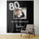 Une tapisserie pour une fête des 80 ans. Fond noir, texte blanc. Personnalisez et ajoutez une photo de haute qualité, du texte, un nom et une date. Le numéro 80 est écrit avec une police de style ballon en faux argent. Peut être utilisé comme décoration murale pour la fête ou comme toile de fond pour un photomaton.