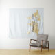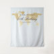 Fond personnalisé pour un photomaton ou une station de selfie lors d'une fête d'anniversaire sur le thème du voyage avec leur nom, âge et date de fête ou de naissance imprimés sur une tapisserie en tissu doux avec notre carte du monde de couleur or jaune et un fond bleu clair. Le style de police rappelle les polices utilisées sur les cartes anciennes et les vieux globes, mais le design est simple pour que vos invités soient ceux qui brillent sur chaque photo prise à l'entrée de votre événement.