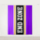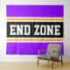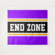 Cette conception sportive et sportive présente du texte en gras END ZONE à l'intérieur d'une large bande noire surlignée avec deux bandes de course blanches et jaunes contre des rayures arrière - plans violettes. Le texte de cette conception peut être personnalisé.