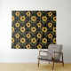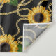 Tapisserie à la motif élégante et design. Joli tournesol jaune et feuilles verts entourés de fines chaînes d'or. Arrière - plan noir.