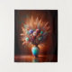 Bouquet vif de disposition fleur sauvage dans un vase opalescent avec un cou étroit et ouverture flanquée. L'agencement comprend différentes fleurs dans les tons violets, roses, blancs et bleus, ainsi qu'un assortiment de plumes et de feuilles qui arborent des teintes de brun, d'or et de vert. Ces éléments créent un affichage luxuriant sur un fond de cuivre chaud qui a des allures de turquoise assortis au vase. L'éclairage accentue les textures et les couleurs du bouquet et du vase, projetant des ombres douces sur l'arrière - plan ajoutant de la profondeur à la composition. 🌸 🌿