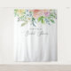 Joli fond de cabine photo de mariage floral avec des roses, des fleurs et de la verdure peints avec des couleurs pastel douces ainsi que "Mariage" dans un script élégant et délicat. La palette de couleurs principale est corail avec une tonalité pêche. Ajoutez votre nom à cette tapisserie botanique pour un fond de cabine photo personnalisé.