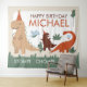 Créez un fond de cabine photo ou un décor de table de dessert pour une fête d'anniversaire de dinosaure amusante avec cette tapisserie. Ce design présente un troupeau de dinosaures illustrés modernes mignons. Ce design préhistorique comprend les dinosaures préférés de tous : T-Rex, Stegosaures, Triceratops, Brachiosaure, Allosaure, Ptérodactyle et plus encore ! Tous les dinosaures sont prêts à faire la fête !