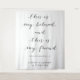 Un bel élément de décoration parfait comme fond pour votre cérémonie, présentant le verset biblique populaire "celui-ci est mon bien-aimé, et celui-ci est mon ami" Salomon 5:16 dans une police de style calligraphie moderne noire, avec la référence ci-dessous en petite police serif. Personnalisez avec vos noms et date de mariage. Utilisez comme décoration chez vous après votre mariage.