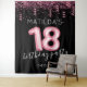 Fond de photobooth pour fête d'anniversaire 18 ans avec un fond noir tendance, paillettins roses et confettis, 18 ballons roses, le nom de la fêtée et la date.