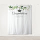 Un magnifique fond pour photo pour ajouter une touche spéciale à votre fête de remise de diplômes. Ce design présente un arrangement d'eucalyptus vert en aquarelle sur fond blanc, et une casquette de diplômé noire et dorée en dessous. "Félicitations" est écrit en police cursive noire et votre nom et date de promotion sont également en police sans empattement noire.