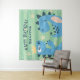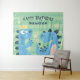 Un joli fond pour photo avec un thème de dinosaures, ce design présente 2 dinosaures de style cartoon en bleu sur un fond rayé vert avec des étoiles jaunes et des confettis dispersés. Le texte Joyeux Anniversaire peut être personnalisé pour inclure le nom de votre enfant. Cet article fait une merveilleuse décoration murale de fête que les enfants peuvent utiliser comme un joli fond pour des selfies et des séances photo avec leur famille et leurs amis.