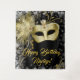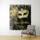 Fond de fête d'anniversaire masqué avec un beau masque de mascarade doré sur un fond bokeh noir, or et blanc. Cette belle bannière de fond de fête masquée noire et or est facilement personnalisable avec le texte de votre choix. Vous pouvez changer la couleur du fond et du texte.