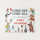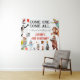 Fond de photo de paysage de fête d'anniversaire sur le thème du cirque coloré - Le design présente le texte 'VENEZ TOUS, VENEZ TOUS au plus grand anniversaire!', le nom et l'âge de l'enfant. Les illustrations vintage à l'aquarelle rétro sont parfaites pour une célébration sur le thème du cirque, de la fête foraine ou du festival. Idéal pour les séances photo et pour ajouter à la décoration de la fête !