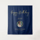 Cette tapisserie moderne est parfaite pour une fête d'anniversaire sur le thème des couleurs bleu marine et or chic. Vos invités apprécieront prendre une photo avec ce fond de fête sophistiqué et se souviendront de votre jour spécial. Le design présente l'inscription "Joyeux Anniversaire" en écriture pinceau dorée et un texte personnalisé. Vous pouvez personnaliser le nom, l'événement et la date en bas de la tapisserie. Merci !