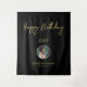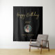 Cette tapisserie moderne est parfaite pour une fête d'anniversaire sur le thème des couleurs noir et or chic. Vos invités apprécieront prendre une photo avec ce fond de fête sophistiqué et se souviendront de votre journée spéciale. Le design présente l'inscription "Joyeux Anniversaire" en lettres dorées et un texte personnalisé. Vous pouvez personnaliser le nom, l'événement et la date en bas de la tapisserie. Merci !