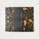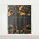 Une illustration originale de fleurs d'hibiscus jaune vif et orange romantiques d'été, de fleurs de chrysanthème à pompons rouges avec des vignes vertes tourbillonnantes et une silhouette d'oiseaux hirondelles fantaisistes sur un fond de tableau noir. Un beau design floral tropical et élégant pour un mariage de jardin.
