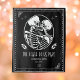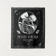 Fond de mariage ou de réception de mariage jusqu'à ce que la mort nous sépare avec un couple de squelettes, noms personnalisés et date établie. Conception en noir et blanc avec un style gothique.