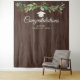 Un beau fond de photo pour ajouter quelque chose de spécial à votre fête de remise de diplôme. Ce design présente un arrangement d'eucalyptus vert à l'aquarelle sur un bois foncé peint et une casquette de remise de diplôme blanche et dorée en dessous. "Félicitations" est en police cursive blanche et votre nom et classe/date sont également en police sans empattement blanche.