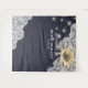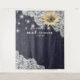 Modèles de toile de fond de photobooth pour douche de mariée / célébration de mariage - Tournesols élégants, cadre en dentelle vintage et guirlandes lumineuses chic sur fond bleu marine.
