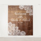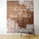 Cette superbe tapisserie de bienvenue présente un fond en bois brun de style rustique bordé de dentelle blanche romantique qui sera parfaite pour un mariage de style champêtre de rêve. Le design est disponible dans une suite : https://www.zazzle.com/collections/rustic_barn_wood_string_lights_lace_wedding-119504651064237505