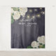Modèles de toile de fond pour photobooth de mariage / célébration de mariage - Élégantes fleurs d'hortensia blanches et guirlandes lumineuses sur un fond en lin floral bleu marine vintage.