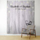 Modèles de fond de photobooth de mariage - Lettre élégante, verres à champagne vintage et guirlande lumineuse sur fond en bois rustique.