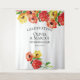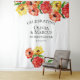 De brillantes fleurs de gerbera rouge et jaune illuminent son arrière-plan de jardin pour votre photobooth de mariage - (ou comme fond coordonné pour votre livre d'or ou table de mariage) - écrit avec les noms des mariés et la date du mariage dans un style moderne et contemporain.
