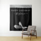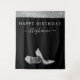 Elegant et chic moderne argent et noir Joyeux Anniversaire Photo Backdrop Toile de fond Selfie Bannière avec faux talons hauts à pailletés argentés et nom en écriture cursive personnalisé en noir et blanc.