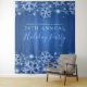 Fond de scène pour table de dessert de fête de Noël / vacances d'entreprise élégante "Glamour hivernal bleu" avec flocons de neige scintillants et guirlandes lumineuses.