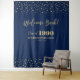 Cette tapisserie moderne est parfaite pour une fête de retrouvailles de classe chic avec un thème de couleur bleu marine et or. Un fond de scène photo personnalisé élégant pour se souvenir de votre journée spéciale. Le design présente une typographie dorée "Bienvenue !" avec un fond de confettis. Vous pouvez personnaliser l'année de promotion, le nom de l'école et la date de l'événement.