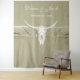 Fond de scène rustique sauge verte blanc rustique taureau crâne de vache country western cowboy mariage réception photobooth. Style ferme vintage imprimé texture en détresse. Style wild west ancien accessoire de mariage antique. Design animal de ferme moderne, tendance, cool. Personnalisez le script. Image copyright Marg Seregelyi Photography.