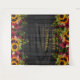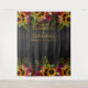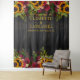 Fleurs de soleil jaunes dorées et bordures de bouquets de roses burgondes rouges foncés sur un fond de bois de grange brun foncé avec votre texte personnalisé en typographie dorée fausse créant un beau fond de stand photo de mariage rustique. ++++++++++ Facile à personnaliser et parfait pour les mariages à thème rustique vintage traditionnel de fin d'été, d'automne ou d'hiver.
