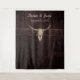Fond de photomaton de réception de mariage de cowboy western de crâne de vache de taureau rustique. Texture marron personnalisée de style de ferme pour les mariés. Ancien prop de mariage inspiré de l'ouest sauvage vintage. Conception d'animal de ferme moderne tendance et cool. Personnalisez votre typographie. Image copyright Marg Seregelyi Photographie.