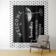 Tapisserie personnalisée pour enterrement de vie de jeune fille rétro en noir et crème avec un verre à cocktail, parfaite comme toile de fond pour photos de fête d'enterrement de vie de jeune fille. Célébrez votre douche nuptiale avec style avec le thème parfait de la fête cocktail en monochrome gras, le thème idéal pour la mariée nostalgique vintage des années 70 et ses demoiselles d'honneur.