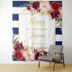 Tapisserie élégante à motif floral avec des fleurs de couleur burgundy et crème sur des rayures blanches et bleues marine. Ce fond de photobooth est parfait pour les fêtes d'anniversaire, les enterrements de vie de jeune fille, les baby showers et plus encore.