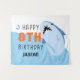 Fond d'anniversaire requin pour les enfants. Panneau d'entrée pour les 8 ans en bleu et orange pour la décoration d'anniversaire d'un garçon ou d'une fille de huit ans.