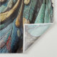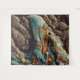 Un portrait d'un ancien rapace disparu dans les rochers, créé en relief avec des teintes comme turquoise, jaune foncé, orange et bleu, avec des rochers dans l'arrière - plan, avec un effet réaliste à l'oeil ouvert ajoute une touche magique à cette oeuvre enchanteresse et colorée.